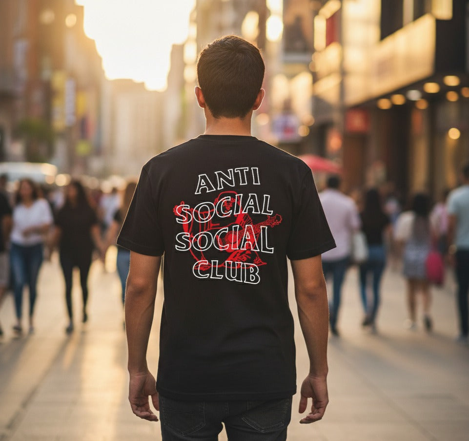 El gráfico muestra a un Buda tocando la guitarra en color rojo , acompañado del logotipo icónico “Anti Social Social Club” en tipografía en negrita.